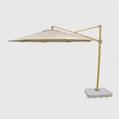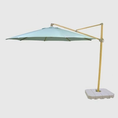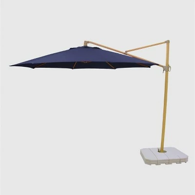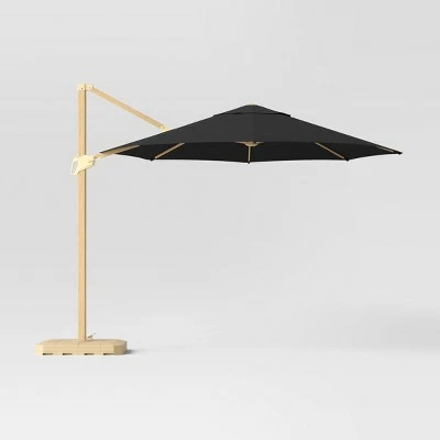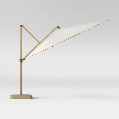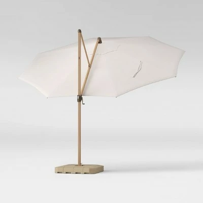 Whether you’re relaxing by the pool, enjoying a family meal at the patio dining table or hosting a summer get-together in the front yard, make sure you’ve got the perfect shade with the Round Offset Patio Umbrella with Base from Threshold™. Constructed from weather- and UV-resistant aluminum for lasting durability, this cantilever patio umbrella has a stylish faux-wood pole with a fabric shade on top that will keep family and guests cool and protected from the harsh rays of the sun. With the crank lift and auto-tilt feature, you’ll love how easily you can adjust it to your desired position — just keep cranking until the tilt is exactly where you want it.