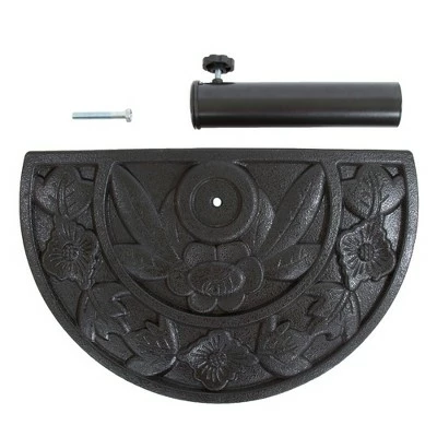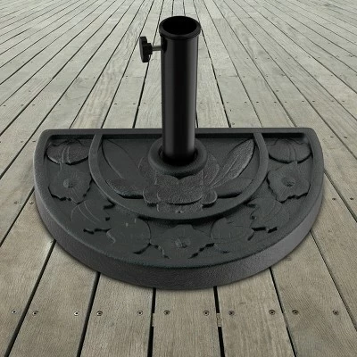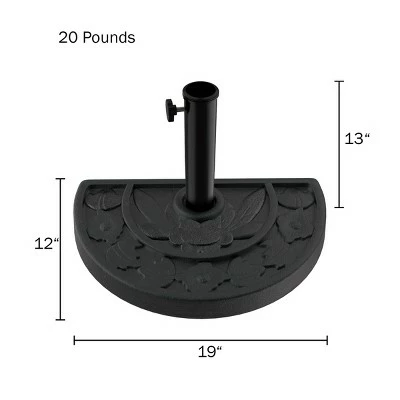 Keep your deck or patio in the shade with the 20 Pound Half Round Umbrella Base by Pure Garden. This weighted base is meant to be used with half umbrellas. It’s great for use on smaller decks, balconies or patios since the flat edge allows it to be placed flush against a wall or railing. The base has a durable resin and concrete construction and weighs 20 pounds. This makes it strong enough to stand up to use in most weather. The upright pipe can be fitted with either of the included collars to accommodate umbrella poles of varying diameters and a screw to help keep your umbrella stable and upright. The attractive floral design is sure to enhance your outdoor decor.