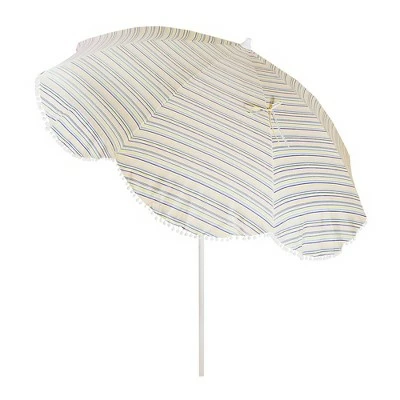 Shade your outdoor area from the bright summer sun with this Joyful Stripe Round Scalloped Umbrella DuraSeason Fabric from Opalhouseâ„¢. This outdoor umbrella makes a unique addition to your patio, deck, backyard or garden decor. It features multicolored horizontal stripes for a fun look, along with scalloped pompom detailing on the edging for decorative and playful style. The round weather-resistant canopy helps you stay shaded from the sun, while a sturdy metal frame offers support. Plus, the push-up lift mechanism helps to easily open and close the umbrella.