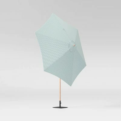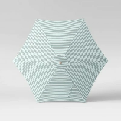 Equip your outdoors for sunny weather with this Turquoise Crestwood Stripe Round Patio Umbrella DuraSeason Fabric from Threshold™. This outdoor umbrella makes a perfect addition to your patio, deck, backyard or garden decor. Covered in water- and fade-resistant fabric for outdoor use, it features a turquoise striped pattern to add a cool-contemporary look. The round canopy helps you stay shaded from the sun, while the metal frame offers support. Plus, it’s equipped with a tilt function to position the umbrella at your desired angle, along with a built-in crank on the pole that makes it easy to open and close the umbrella.