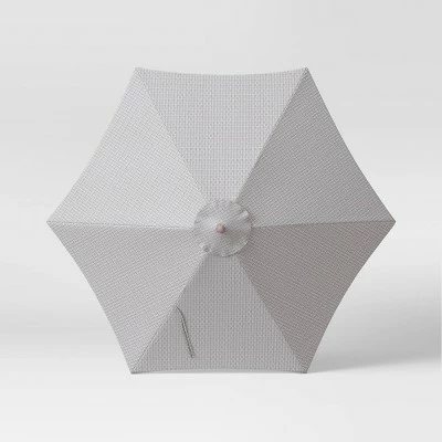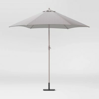 Equip your outdoor space for sunny days with this Gray/White Geo Round Patio Umbrella DuraSeason Fabric from Project 62â„¢. This outdoor umbrella makes a must-have addition to your patio, deck, backyard or garden decor. Made of water- and fade-resistant fabric for durable outdoor use, it features a gray geometric pattern on a white base for a chic contemporary look. The round canopy helps you stay shaded from the sun, while a metal frame offers a sleek foundation. Plus, it’s equipped with a tilt function to position the umbrella at your desired angle, along with a built-in crank on the pole that makes it easy to open and close the umbrella.