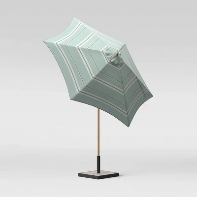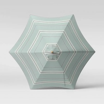Create a space for everyone to enjoy with the 9-Foot Round Patio Umbrella Aqua Light Wood Pole from Threshold™. Featuring white and gray stripes on an aqua background, this vented patio umbrella is UV-resistant, so it’s designed to look its best even after repeated encounters with the summer sun. Supported by a light wood pole, this patio umbrella has a canopy that cranks open and can be tilted to follow the sun for optimal coverage no matter the time of day. Simply set it into an umbrella base at the center of your patio table and you’ve created a festive spot worthy of summer fun.