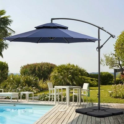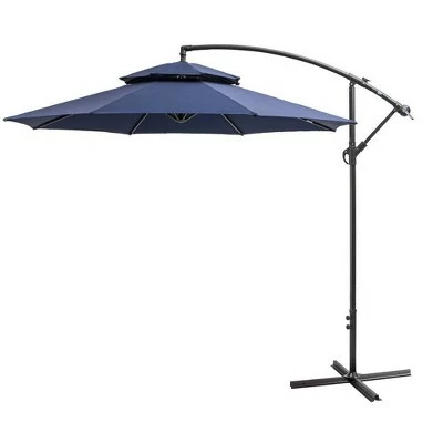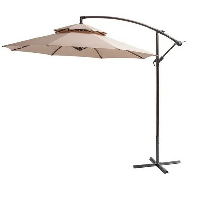Add some shade to your backyard with this 10-foot double top patio umbrella. This umbrella comes with a crank and a cross base. You can move the pole to any outdoor spot you like with the cantilever design, without worrying about it getting in the way of dining or entertaining. This oversized umbrella is colorful and waterproof with polyester fabric. It can provide 10 feet of sun protection to shade a large dining table or conversation set.