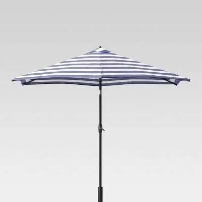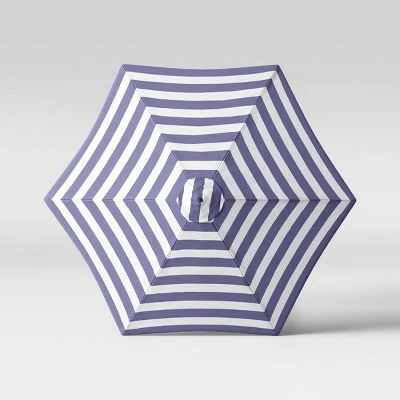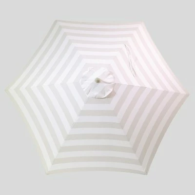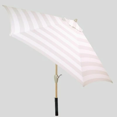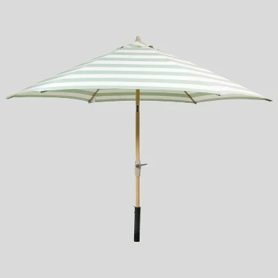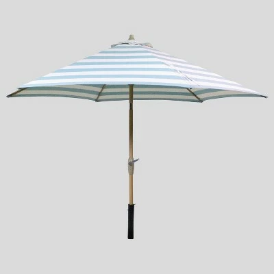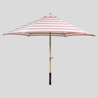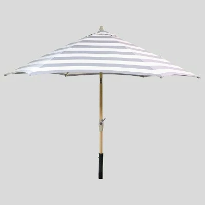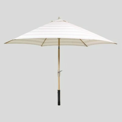 Create a comfortable escape with the 9-Foot Round Cabana Stripe Patio Umbrella Light Wood Pole from Threshold™. Featuring bold stripes on a white background, this vented patio umbrella is weather- and fade-resistant, designed to look its best even after repeated encounters with the wind, rain and sun. Supported by a light wood pole, the canopy cranks open and can be tilted to follow the sun for optimal coverage no matter the time of day. Simply set it into an umbrella base at the center of your patio table and transport yourself into a seaside soiree.