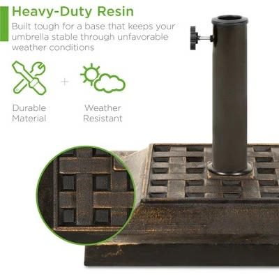 This base is stylishly designed with attractive basketweave indentations to add a hint of style to any setting. Built tough with heavy-duty resin, it keeps your umbrella stable through unfavorable weather conditions. The sturdy base has a 1.75in pole opening to accommodate standard umbrellas up to 7.5 feet without tipping over. With its weather-resistant material, this base is built to last for years to come!