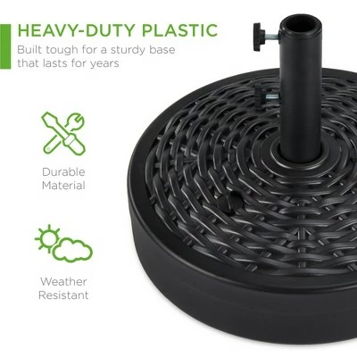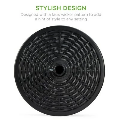 Reinvigorate the patio and garden with the only umbrella stand you need. Designed with a faux wicker pattern to add a hint of style to any setting, this stand is built tough for a sturdy base that lasts for years. Durable materials like HDPE & steel make this a reliable, weather-resistant addition to the garden. This sturdy base is built to accommodate standard umbrellas ranging from 6-10 feet without tipping over (Sand: 50 Lbs Fill Capacity/ Water: 15L Fill Capacity) Made with a built-in handle for easy carrying, plus a slim design that allows for easy storage when not in use. Product Specifications: Overall Dimensions (19.5in x 10.75in) Umbrella Pole Insert (1.9in Dia)
