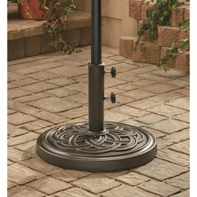 Your patio is where you unwind after a long day. And on those sunny days when you need protection against the harsh sun, you need an umbrella shade. Complete your shady set-up with the CASTLECREEK Weighted Umbrella Stand Base. Sit back and relax with a glass of your favorite cold beverage and let this base hold your umbrella in place. This heavy-duty agglomerated stone construction base holds your umbrella (not included) in place on patio for additional shaded comfort. Featuring a bronze-look finish, this stand is both functional and adds a stylish decorative accent to your outdoor patio space. With a stable, circle-ring design, this stand is stable and secure to keep your umbrella shade upright. This weighted base fits most 9-inch and 11-inch umbrellas with up to 1.8-inch diameter poles. Designed to withstand harsh weather conditions and protect against the elements, you can rest assured that this base will stand the test of time. The umbrella is sold separately, so you can choose one that fits your exact style.So throw the burgers on the grill, pull up a chair and claim your spot in the shade and provide yourself years of cool, shady comfort with the CASTLECREEK Weighted Umbrella Stand Base.