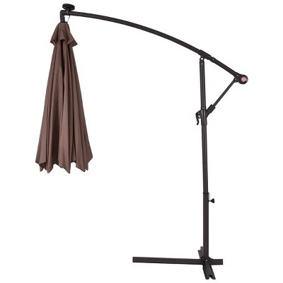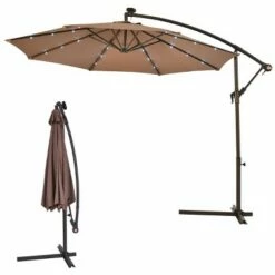 This Is Our 10ft Hanging Offset Umbrella, Sun Tent, Rain Shelter, And More All In One, The Parasol Gives You Instant Portable Protection From The Elements Regardless Of Your Activity. The Beach Umbrella Sets Up In Just Three Seconds. As A Result, You Do not Have To Deal With Finicky Stakes Or Willowy Tarps Should A Rainstorm Roll In Without Notice. Just Pop Open The Umbrella And Ground Stakes For Extra Stability. What is more, in the night, 24 Pre-Installed Solar-Powered LEDs lights will light up and decorate your summer night. Add A New Partner To Make You Happy Journey, Just Take It Home ! /n Feature: Steel Ribs And Pole /n Hanging Umbrella With Crank /n 8 Firm Steel Ribs Construction Support The Canopy Stably /n Solar-Powered 24 LEDs Provide Energy-Efficient Lighting /n with a Heavy Duty Steel Cross Base For Stability /n Round Solar Panel On Top Of Umbrella /n Easy Tilt Operation, Hand-Crank Lift /n Stable For A Beach Umbrella, Sun Tent, Rain Shelter /n UV Protective And Water Repellant /n We Suggest You To Not Leave The Umbrella Open In Windy Conditions /n Note: A weighted base is needed to keep the umbrella steady all the time. /n /n Specification: Color:Tan /n Pole Material:Steel /n Umbrella Cover Material:180g Water-Proof Polyester /n Umbrella Diameter:10Ft /n Total Height:8.4Ft /n package include:1 x 10ft Solar Powered Offset Umbrella with cross base /n