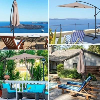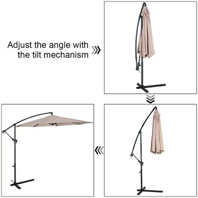 This is our Hanging Offset Umbrella, sun tent, rain shelter, and more all in one, the parasol gives you instant portable protection from the elements regardless of your activity. The beach umbrella sets up in just three seconds. As a result, you don’t have to deal with finicky stakes or willowy tarps should a rainstorm roll in without notice. Just pop open the umbrella and ground stakes for extra stability. Add a new partner to make you happy journey, just take it home !Caution: . Please Fold And Fasten The Umbrella Or Take It Down In Blustery And Thunderstorm Day To Protect The Umbrella . Keep The Umbrella Away From Fireworks . Children Should Be Under The Guidance Of Adults When Using The Umbrella . Make Sure Lay Sandbags, Blocks, Concrete Or Pavers Onto The Base To Add More Strength To The Umbrella Base . Specification: Color: Beige. Umbrella Diameter: 10Ft. Umbrella Cover Material: 180g Water-Proof Polyester. 8 firm steel ribs construction support the canopy stably. Umbrella Diameter: 10Ft,Total Height: 8Ft. Heavy duty steel cross base for stability.