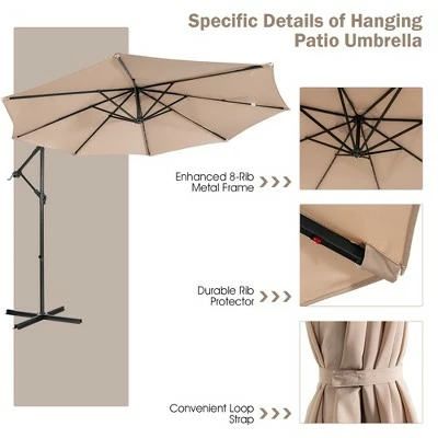 Our patio offset umbrella will offer you with a shady relaxation outdoor place in sunny afternoon. The patio umbrella comes with 8-rib structure and thickened metal pole coated with rust-resistant finish, showcasing excellent firmness and lasting using performance. 32 LED solar lights enables you to enjoy the night time with your family and friends in an atmosphere of relaxed informality. In addition, the tilting adjustment and hand-crank mechanism make sure efficient all-round sun protection. And the sun-protective fabric with high color fastness will block up extra sunlight while keeping fadeless. A weighted base (sold separately) is necessary to enhance stability while using. Detailed instruction and all accessories are given in the package, facilitating assembly. All in all, this hanging umbrella will be a practical decoration in various outdoor occasions. . Specification: Color: WineBeigeCoffeeBlueNavy . Material: Steel, Polyester Fabric . Overall Dimension: 10′ x 10′ x 8.4′ (LxWxH) . Crossed Base Dimensions: 39” x 39” x 2” (LxWxH) . Pole Diameter: 2” . Net Weight: 28.5 lbs . . Package includes: . 1 x Patio Umbrella . 1 x User’s Instruction .