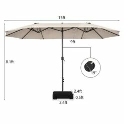 The luxurious outdoor patio umbrella is a good companion outdoors. Our patio offset umbrella is up to 10ft in diameter and provide a large shaded area to protect you and your family from the sun. Meanwhile, the vent at the top of the umbrella allows cool air to flow through, thus creating a comfortable environment for you. And the gliding handle and simple tilting system allow you to adjust the umbrella at any angle. You can also freely rotate the umbrella to the position you like. Moreover, the patio umbrella is made of high quality powder coated aluminum rod and polyester fiber, which is durable enough to be used for a long time. The most important thing is that the offset umbrella has 32 LED lights powered by solar panels, which can provide perfect illumination at night. Please don’t miss it.. Specification: Color: Beige. Material: Steel, Aluminum, Polyester fabric. Overall Dimensions: 10′ x7.5′(L xH) . Net Weight: 30 lbs. Number of Ribs: 8. Number of Lights: 32. Package includes:. 1 x 10ft Solar Powered Offset Umbrella With Cross Base.
