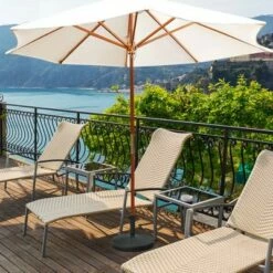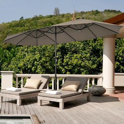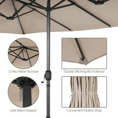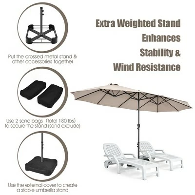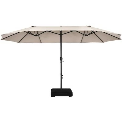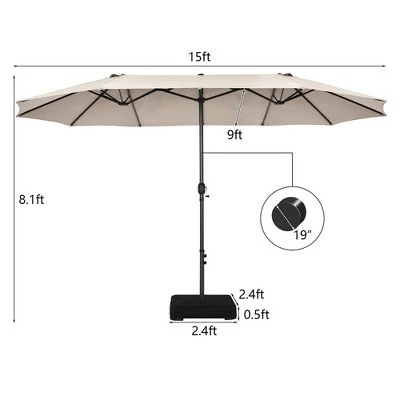 Enjoy leisure time with your family and friends under the shade!. Measuring 15ft x 9ft, this double-sided umbrella provides a wide coverage of shade to allow several people getting together to chat under sunny days. Besides, the patio umbrella comes with sturdy metal structure and sun-protective fabric, which can ensure high durability and protection. And the bottom base is constructed with a crossed metal frame, 2 sand bags (a filled sand bag weighs 90lbs) and an external cover, so you don’t need to buy an enhanced base additionally. Furthermore, this outside patio umbrella has user-friendly crank mechanism that helps you to open and close the umbrella with ease by rotating the crank handle. In a word, our patio twin umbrella is perfect for outdoor use, such as backyard, garden, poolside and fairground. . Specification: Color: WineBeigeCoffeeGreyvOrangeTurquoise. Material: Steel, Polyester Fabric. Overall Dimension:15 ft x 9 ft x 8.1 ft (LxWxH) . Base Size: 2.4 ft x 2.4 ft x 0.5 ft . Diameter of Umbrella Pole: 1.9” . Net Weight: 38.5lbs. Package includes: . 1 x Patio Umbrella. 1 x Cross Base. 2 x Sandbags. 1 x External Cover . 1 x Instruction.