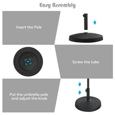 This 49lbs resin umbrella base will be a fabulous choice for outdoor usage. The heavy weight ensures high stability of the patio umbrella. And we selected high-grade resin as the material of the umbrella base, enabling remarkable performance on resisting heavy sunlight, water and corrosion. Additionally, the umbrella base not only possesses practical utilities but also owns attractive appearance. Such a heavy-duty resin umbrella base is perfect for outdoor use. Umbrella poles of 1.5” and 1.9” can be used with our base. You will not regret if you get this resin umbrella base. Specification: Color: Black. Material: Resin + Steel. Overall Dimension: 20.5” x 14” (D x H). Suitable Diameter of Pole Hole: 1.5” / 1.9”. Length of Steel Pole: 10”. Net Weight: 49 lbs. Package Includes:. 1 x Resin Umbrella Base. 1 x Instruction.