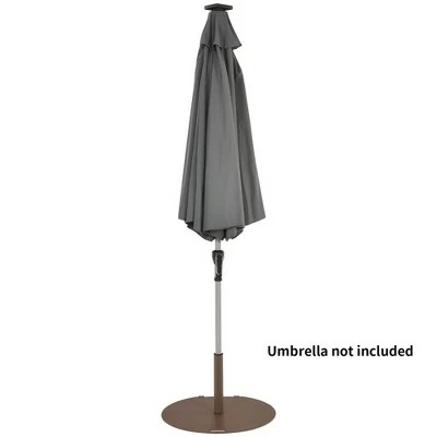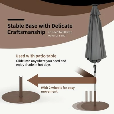 Our umbrella base is your perfect partner helping you to have more enjoyable outdoor time. Made of heavy-duty steel frame with powder coating, the umbrella base is not easy to rust, chipping and peeling for years to come. With 2 hand tightening knobs, the umbrella stand offers a secure grip for tightening the position of the umbrella pole in windy conditions. It also comes with two flexible wheels, bringing much convenience to take it anywhere. Because of the three adapters, the umbrella base is perfectly compatible with 1.37”/1.49”/1.88” diameter umbrella pole, which makes it an ideal choice for balcony, poolside, backyard. . Specification: Color: Brown. Material: Steel, Plastic. Overall Dimension: φ27.5” x 27.5”(W) x 14.5” (H) . Diameter of Poles: 1.37”/1.49”/1.88” . Net Weight: 50lbs. Package includes: . 1 x Umbrella Base. 1 x User Guide.