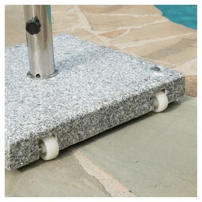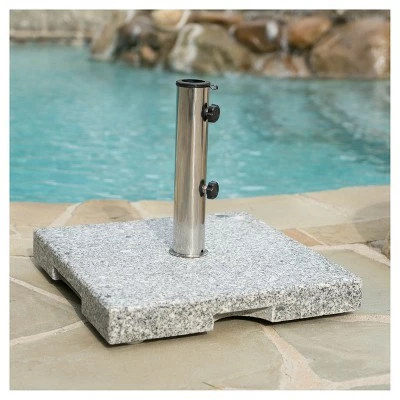 The Christopher Knight Home Mojave Square Granite and Stainless Steel Umbrella Base ensures that your umbrella will remain securely intact with style and practicality. Built out of solid steel and concrete, the 60 pound base can accommodate an umbrella as large as 12 feet. The base rod features a tightening knob to easily secure any sized umbrella pole. Place this Christopher Knight Home Mojave Square Granite and Stainless Steel Umbrella Base under your dining set to provide a shady and relaxing outdoor dining experience with your favorite outdoor umbrella.