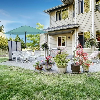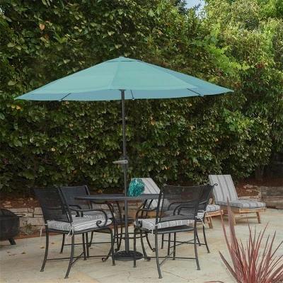 Cool down beneath the ample coverage of this Nature Spring Patio Umbrella. This 9′ umbrella is a lovely dusty green hue to add a pop of color to your outdoor living space. Use the easy-crank handle to deploy the umbrella’s canopy, which is constructed from weather-resistant polyester fabric for lasting beauty and performance. The generous size of this patio umbrella makes it an excellent choice for tables that seat up to six people.