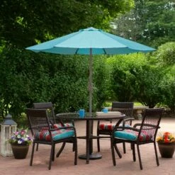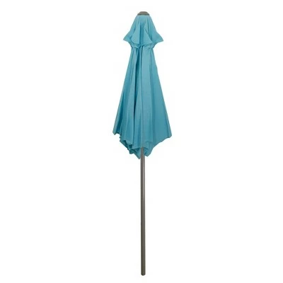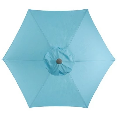 Enjoy tons of fresh air this summer without having to sit in the hot sun. Ideal for covering a 30-inch bistro style table. Features a sturdy, powder-coated aluminum frame with steel ribs, built to last a lifetime. The crank opening allows for ease of use. Features:Umbrella shape: hexagon Canopy color: turquoise blue Frame and pole color: brown Diameter of open umbrella: 6.5′ Height: 7.5′ Pole diameter: 1.5″ (38mm) Lift: hand crank 6 ribs Material(s): 160 gram polyester canopy/powder-coated aluminum pole/steel ribs Note: Umbrella only, base is not included