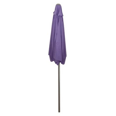 Keep the sun at bay in style with this richly colored market umbrella. Perfect coverage for a 30-inch bistro table and two chairs. Crank opening for easy use with a powder-coated steel frame and ribs for durability.Features:Umbrella shape: hexagonCanopy color: purpleFrame and pole color: brownDiameter of open umbrella: 7.5’Height: 7.5’Pole diameter: 1.5″ (38mm)Lift: hand crank6 ribsMaterial(s): 160 gram polyester canopy/powder-coated steelNote: Umbrella only, base is not included