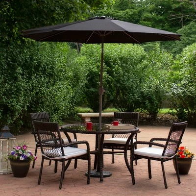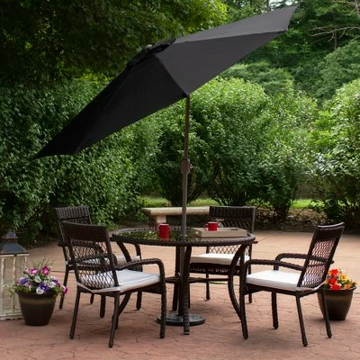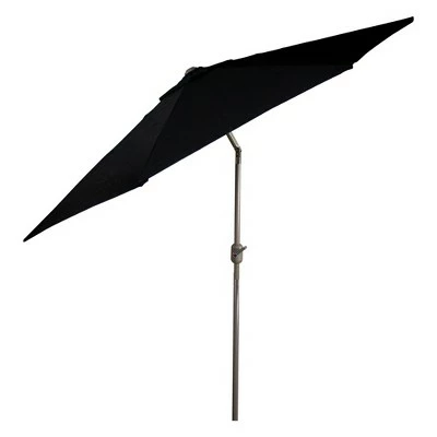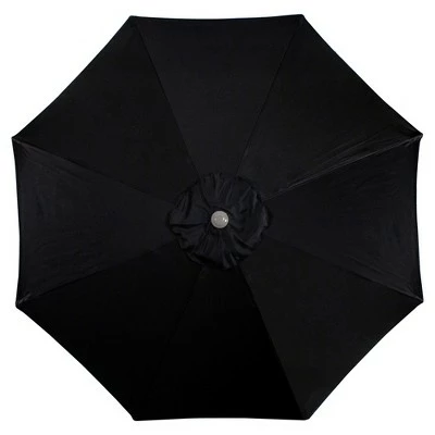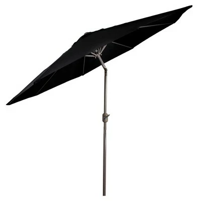 Stay shaded and cool this summer with our moderately sized market umbrella. Ideal for covering a 48-inch or four-person dining set. Features a sturdy, powder-coated aluminum frame with steel ribs, built to last a lifetime. The crank opening and push-button tilt mechanism allows for ease of use. Features:Umbrella shape: octagon Canopy color: blackFrame and pole color: brownDiameter of open umbrella: 9′ Height: 8′ Pole diameter: 1.5″ (38mm) Lift: hand crank Tilt: push-button8 ribs Material(s): 160 gram polyester canopy/powder-coated aluminum pole/steel ribs Note: Umbrella only, base is not included