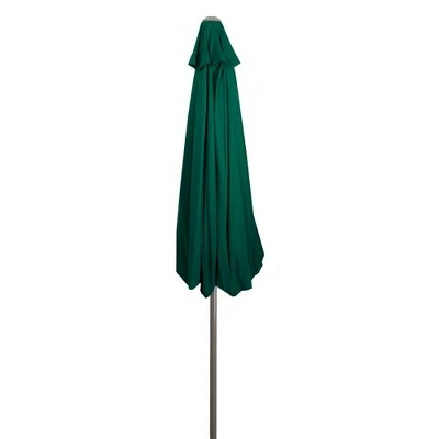 Stay shaded and cool this summer with our moderately sized market umbrella. Ideal for covering a 48-inch or four-person dining set. Features a sturdy, powder-coated aluminum frame with steel ribs, built to last a lifetime. The crank opening and push-button tilt mechanism allows for ease of use. Features:Umbrella shape: octagon Canopy color: hunter green Frame and pole color: brownDiameter of open umbrella: 9′ Height: 8′ Pole diameter: 1.5″ (38mm) Lift: hand crank Tilt: push-button8 ribs Material(s): 160 gram polyester canopy/powder-coated aluminum pole/steel ribs Note: Umbrella only, base is not included