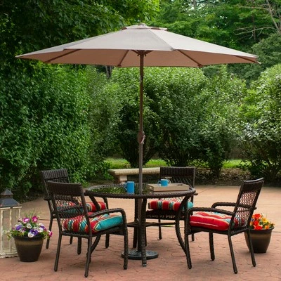 Stay shaded and cool this summer with our moderately sized market umbrella. Ideal for covering a 48-inch or four-person dining set. Features a sturdy, powder-coated aluminum frame with steel ribs, built to last a lifetime. The crank opening and push-button tilt mechanism allows for ease of use. Features:Umbrella shape: octagon Canopy color: taupeFrame and pole color: brownDiameter of open umbrella: 9′ Height: 8′ Pole diameter: 1.5″ (38mm) Lift: hand crank Tilt: push-button tilt 8 ribs Material(s): 160 gram polyester canopy/powder-coated aluminum pole/steel ribs Note: Umbrella only, base is not included