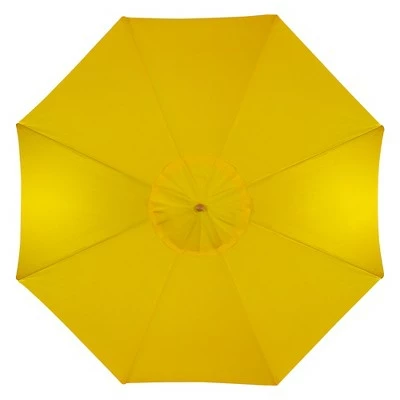 Enjoy tons of fresh air this summer without having to sit in the hot sun with our 9-foot traditional style wooden market umbrella. Ideal for covering a 48-inch or four-person dining set. Features sturdy wood frame, ribs, and pole that are built to last a lifetime. The double wheel pulley allows for ease of use. Features:Umbrella shape: octagon Canopy color: yellowFrame and pole color: wood Diameter of open umbrella: 9’Height: 8′ Pole diameter: 1.5″ (38mm) Lift: double wheel pulley 8 ribs Plastic finial top Material(s): 160 gram polyester canopy/wood pole and ribs/plasticNote: Umbrella only, base is not included