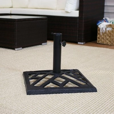 Make sure the patio umbrella stays firmly secured with this decorative patio umbrella base. Made of strong and durable cast iron, this patio umbrella stand will stay in place and prevent the umbrella from tipping over, even in windy conditions. This stand features two thumb screws to hold the patio umbrella in place and can accommodate poles between 1.25 and 2 inches diameter. The intricate geometric design adds a stylish element to this functional piece of outdoor decor.