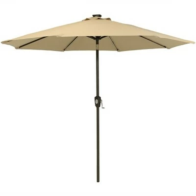 This solar Sunbrella outdoor patio market umbrella is perfect for any outdoor backyard or patio space, at festivals, or at the cabin/camper. It is designed for use as a freestanding umbrella (base not included) or with an outdoor dining table (ranging from 42″ – 54″). The patio umbrella canopy is engineered to last with a 103″ diameter canopy made from 100% solution-dyed 220g acrylic Sunbrella fabric. Solution-dyed means that the fibers the fabric is made from are dyed before being woven which results in a more long-lasting, fade and stain resistant color. The 2000-hour color fastness means that this fabric will not fade as quickly as others. The pole and ribs are made from rust resistant powder-coated aluminum while the fittings are stainless steel. Solar operated LED light bars are located along each of the umbrellas 8 ribs. When fully charged, the solar lights will run up to 3-4 hours. To turn on simply use the buttons located on the umbrella pole. There are 3 different sections, choose any section to light up, a combination of 2, or have all on at once. The solar panel is located on top of the umbrella that is charged via direct sunlight during daylight hours. The umbrella’s 1.5″ diameter pole means that it can fit most standard-size bases. To use the auto-tilting option simply open the umbrella all the way and keep cranking it until the desired tilt angle is reached. Images include product in nighttime environment.