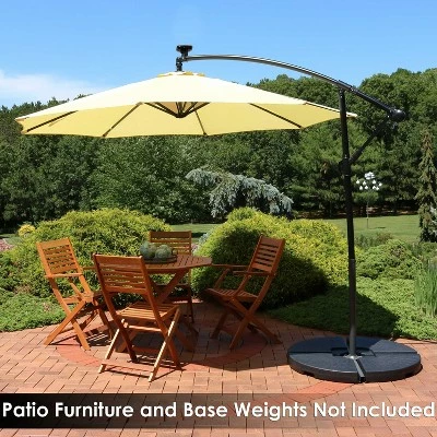 Enjoy shade during the day and gentle illumination in the evening with this Outdoor Cantilever Umbrella with Solar LED Lights from Sunnydaze Decor. Featuring a waterproof polyester umbrella canopy, this outdoor umbrella is designed to be strong enough to hold up against the elements. The umbrella is held together by a durable steel base and pole that provide a sturdy frame. This outdoor patio accessory is easy to set up and adjust with the cantilever and crank. Please note, a heavy base is necessary to place on the crossbase to keep this umbrella securely in place (not included, must be purchased separately).